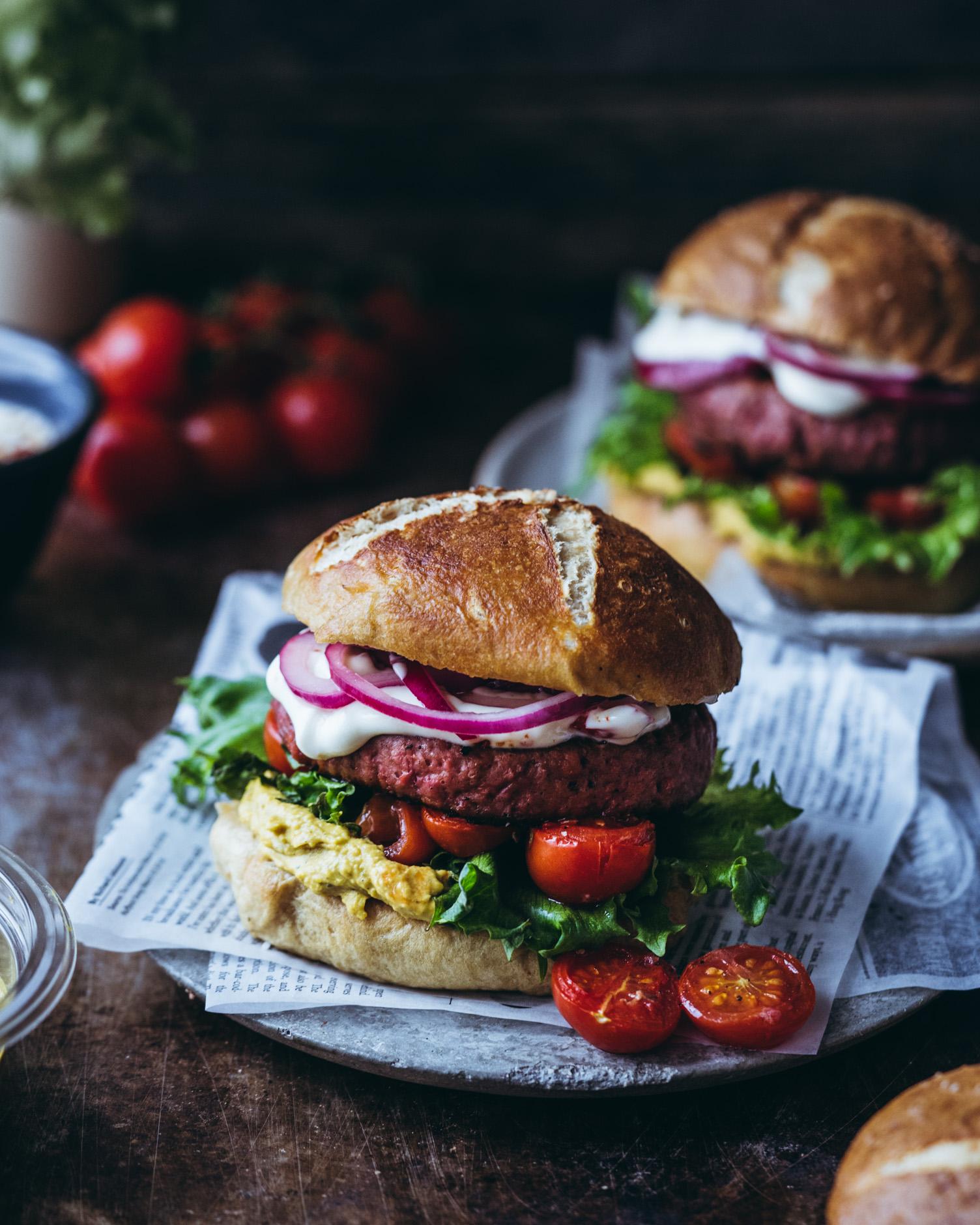 Levittelin curry-hummusta näiden hampurilaisten pohjalle. Erityistä valmistusta vaati vain punasipulien marinoiminen ja tomaattien paahtaminen. Muutoin kaikki vain pilkottiin ja Next Level Burger-pihvit paistettiin. Helppoudestaan huolimatta (miksi sana helppo yhdistetään siihen, että jostain on karsittu?) aivan todella toimiva makuyhdistelmä-kokonaisuus! Niinpä meidän testihampurilaiset oli tehtävä uudestaankin, jotta saisin kuvan ja voisin jakaa tämän reseptin! Testikerralla käytimme Lidlin paistopisteen sämpylöitä hampurilaissämpylöinä, mutta viikonloppuversioon valmistin itse pretzel-sämpylät.