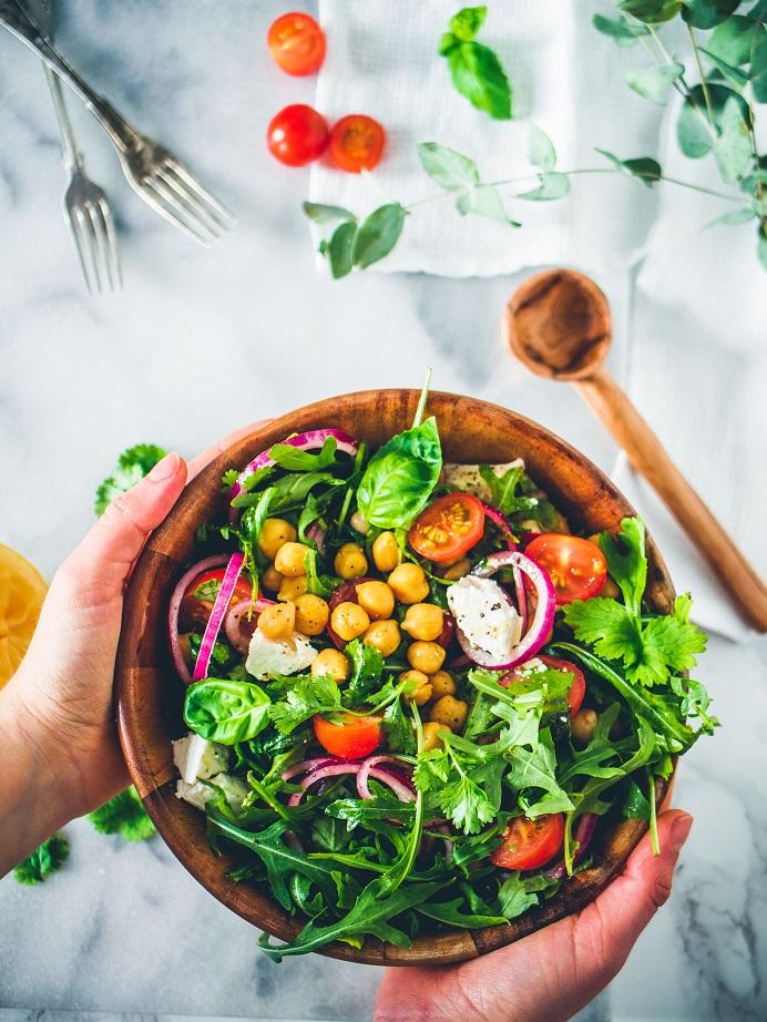 - Voit lisätä kikherneet salaattiin joko kylminä purkista tai lämmittää niitä pannulla oliiviöljyssä, jolloin saat vähän lämpöä salaattiin.