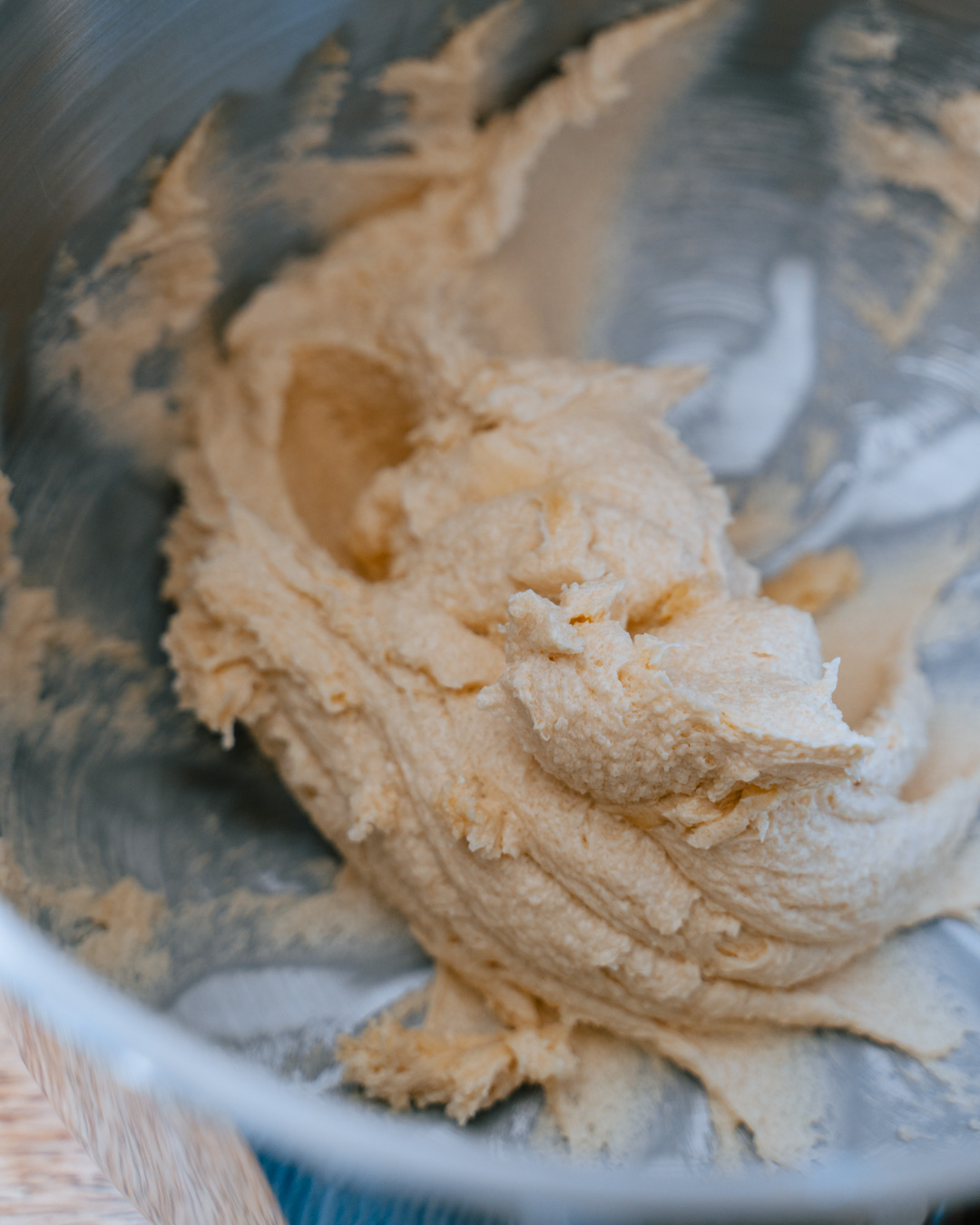 Yllä olevissa taikinoissa on grammalleen samat ainekset, mutta sillä erolla, että ylemmässä kulhossa voi on lisätty sulatettuna ja alemmassa vatkattu kuohkeaksi sokerin kanssa. Tästä jo voi päätellä, että kuohkeaksi vatkatulla voilla = kiinteämpi taikina = vähemmän leviävät keksit