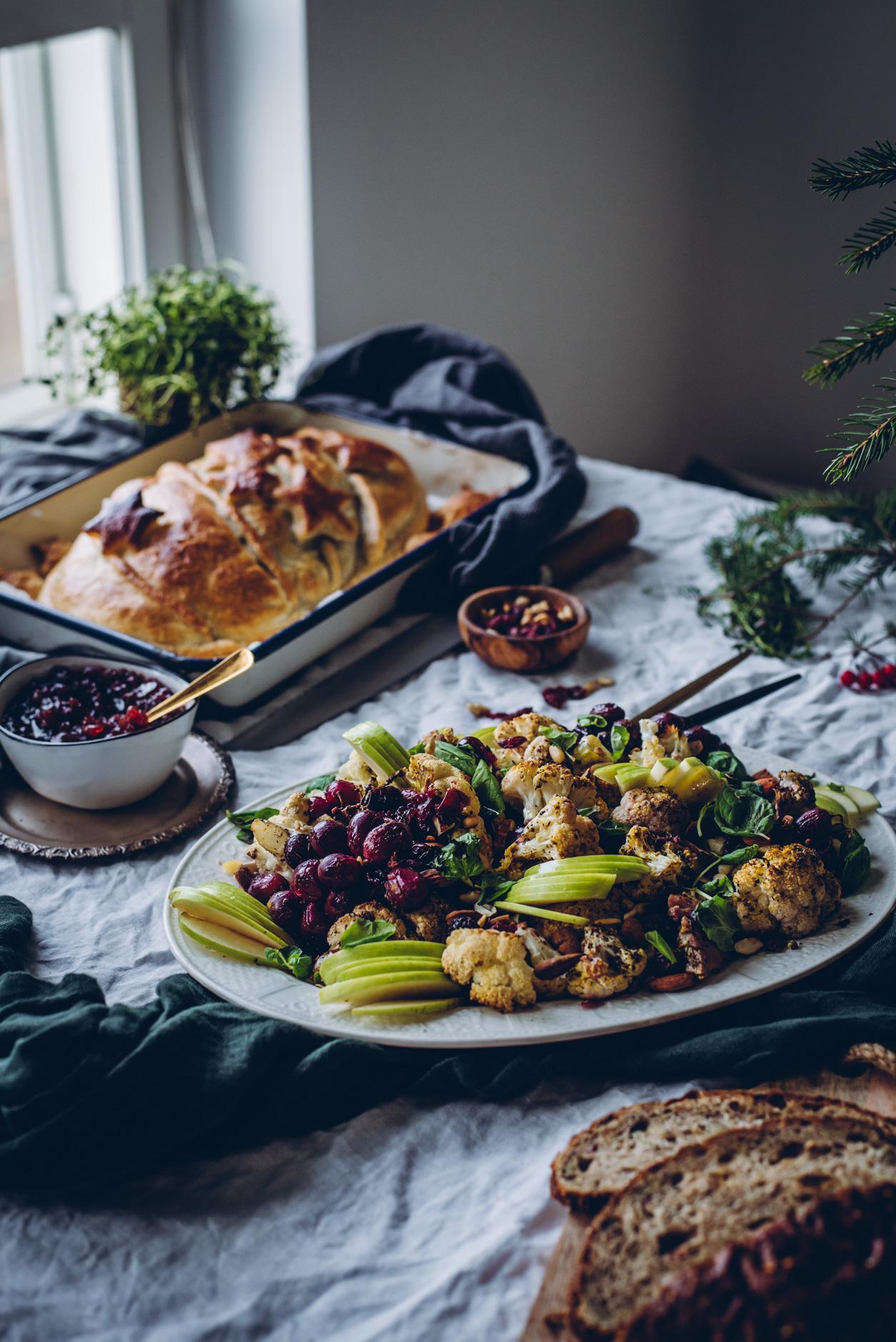 - Sekoita paahdetut kukkakaalit, viinirypäleet, paahdetut mantelit, pinjansiemenet ja aniksensiemenet, sekä omenat ja karpalot keskenään. Revi joukkoon vielä minttua. Viimeistele pistaasi-/oliiviöljyllä ja sitruunamehulla.