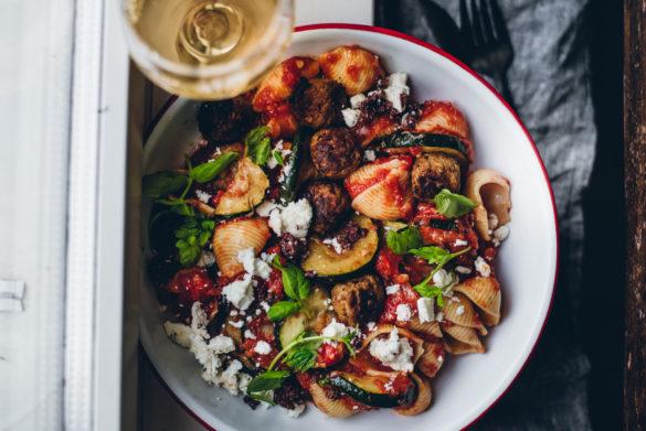 Pasta arrabiata, paahdettuja vihanneksia, tapenadea ja fetaa