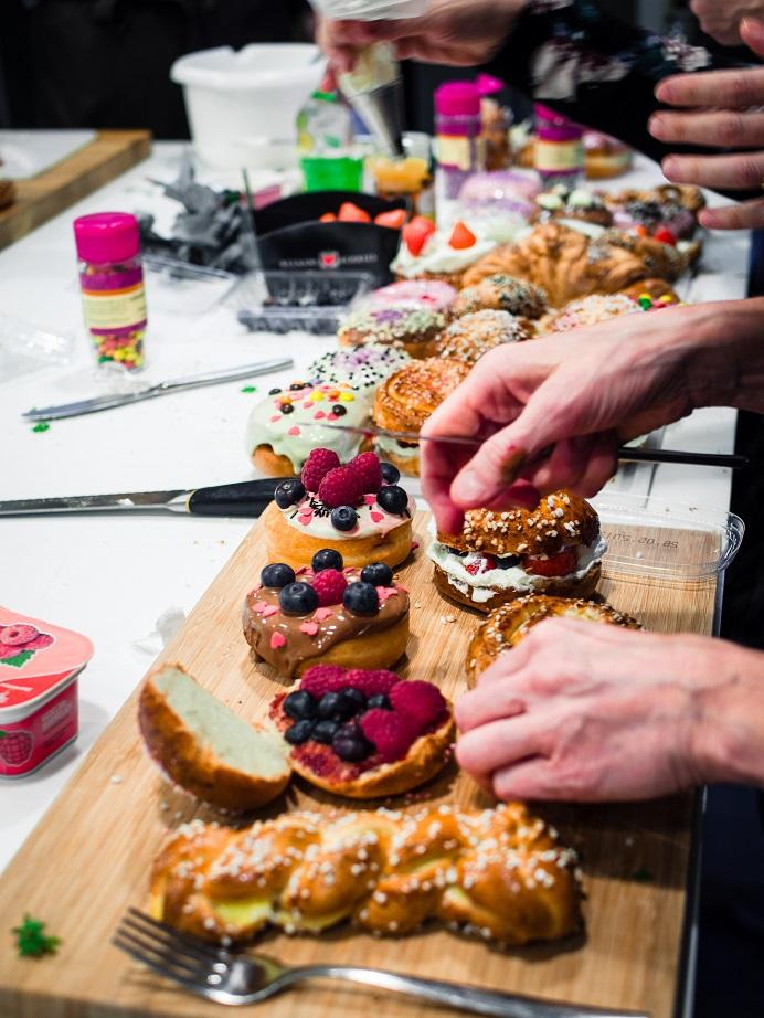 Meitä kultaisen pääsylipun saaneita oli neljä bloggaajaa (Annin Uunissa, Sokerivaltakunta ja Minäkö keski-ikäinen?), jotka saimme seurailla pullien valmistumista, ja tietysti maistella syödä lopputuloksia. Paikan päällä jokainen mahdollinen vapaa alue ja taso oli melkoisten pullavyöryjen alla. Oli viinereitä, kroisantteja, pitkoja, donitseja, munkkeja, pullia – ja kaikki ihan vain syötäväksi tarkoitettu. Siis kirjaimellisesti pullaihmemaa.