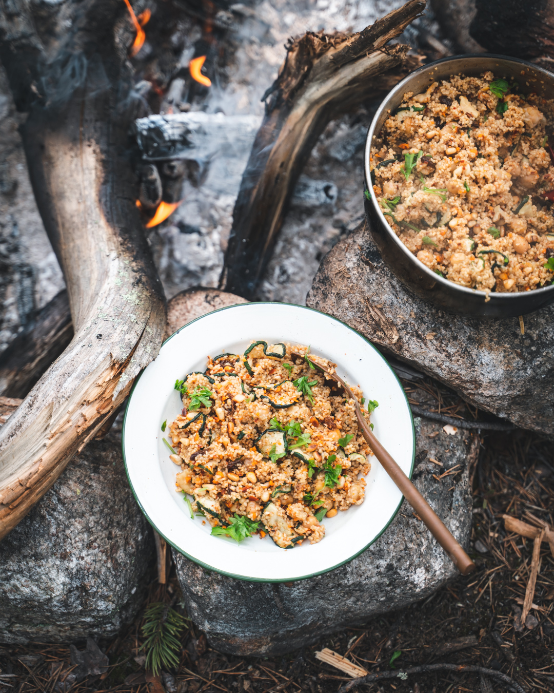 Vaatii vähän enemmän kuivausta, mutta tässä: kuskusta, kuivattua kesäkurpitsaa, kuivattua fetaa, kuivattuja kikherneitä, kuivayrttejä (minttua ainakin), pinjansiemeniä, sekä kuivamausteita (kuivattu ruusu-harissamausteseosta, juustokumina ja korianterijauhe).